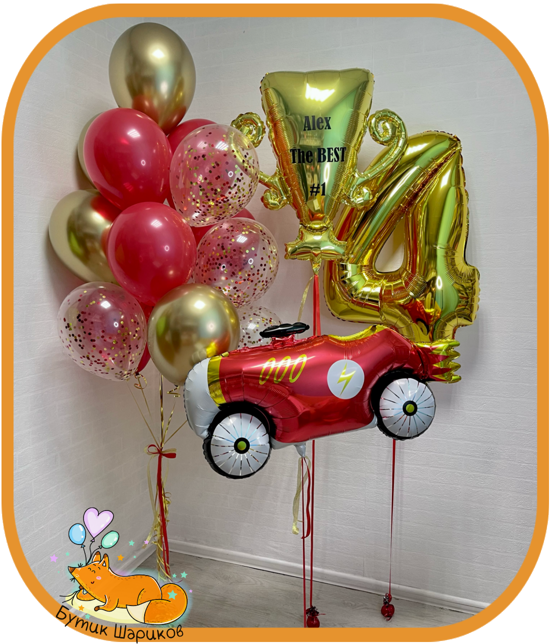 - 5 Шариков "Пастель" красного цвета - 5 Шарикрв "Хром" злотого цвета - 5 Прозрачных шарикрв с конфетти - Шарик фольгированный "Гоночный спорткар" - Цифра - Золотой кубок с индивидуальной надписью - 4 грузика |