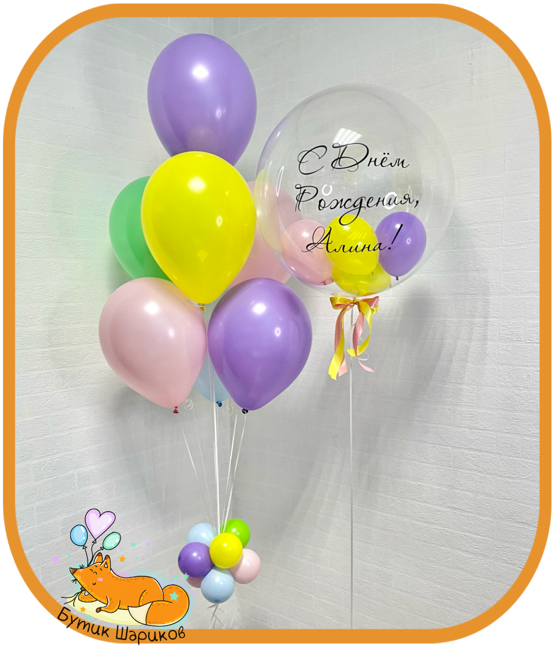 | В наборе: | - 7шариков "Пастель" розовый, зеленый, желтый, фиолетовый, голубой - Баблс с маленькими шариками внутри и индивидуальной надписью - 2 грузика |