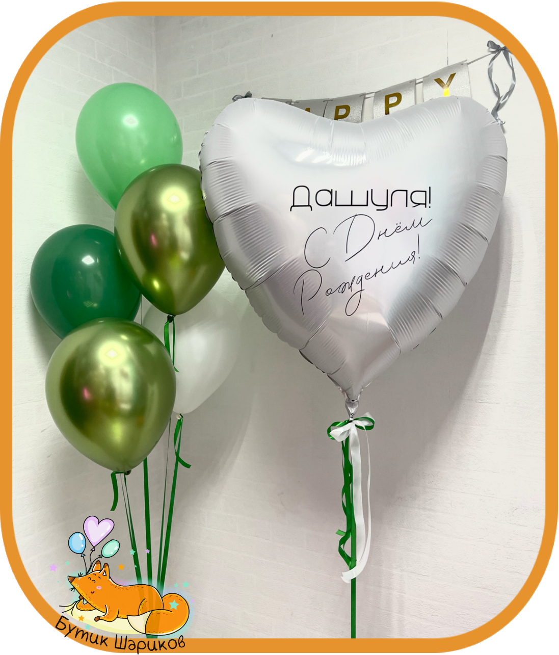 - Белое сердце-гигант с индивидуальной надписью - 2 шарика "Хром" Зеленого цвета - 3 шарика "Пастель" зеленый, темно-зеленый, белый - 2 грузика *Цвет шариков можно поменять по Вашему желанию |