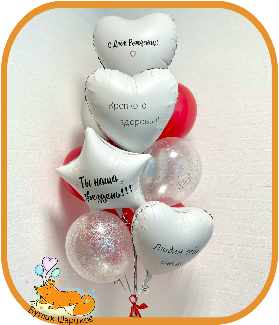 | В наборе: | - 4 фольгированных фигуры с индивидуальными надписями - 4 шарика красного цвета - 2 шарика с конфетти - 2 шарика серебро "Хром" - 1 грузик |