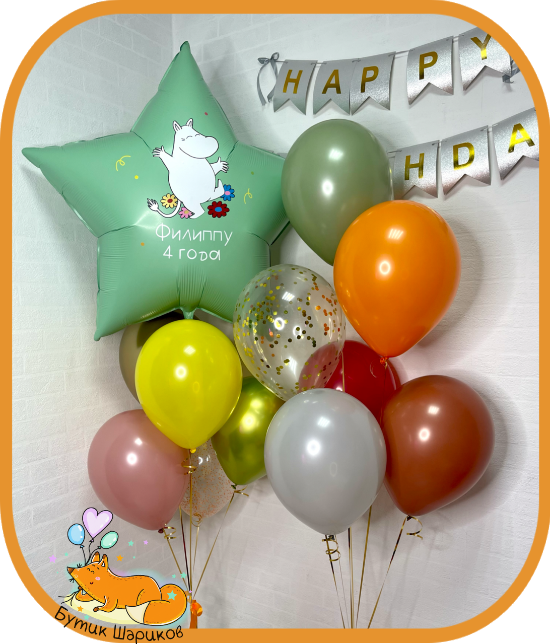 | В наборе: | - 7 шариков "Пастель" - 2 шарика "Хром" - 2 шарика с конфетти - Большая звезда с индивидуальным рисунком и надписью - 2 грузика *Цвет шариков можно поменять по Вашему желанию |