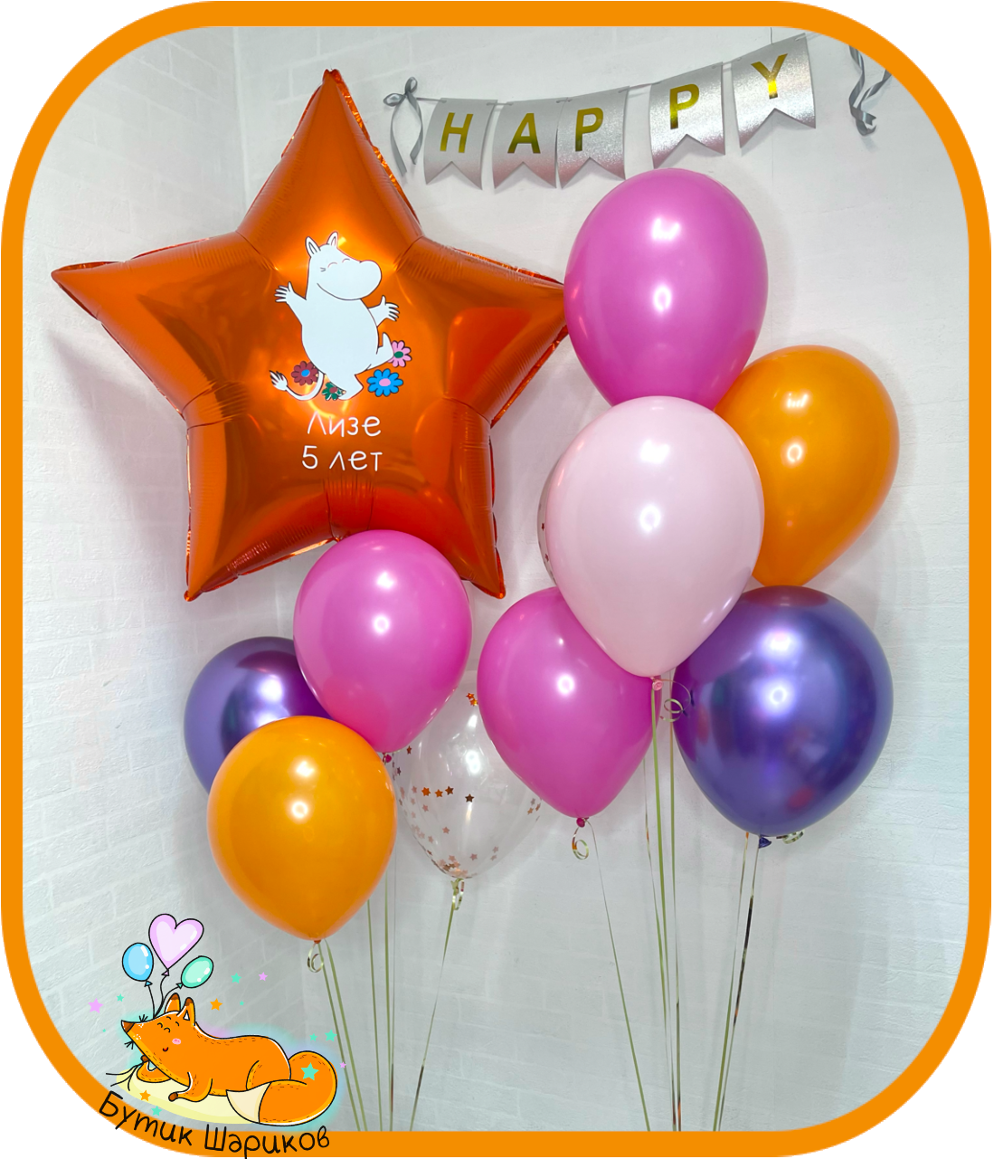| В наборе: | - 7 шариков "Пастель" - 2 шарика "Хром" - 2 шарика с конфетти - Большая звезда с индивидуальным рисунком и надписью - 2 грузика *Цвет шариков можно поменять по Вашему желанию |