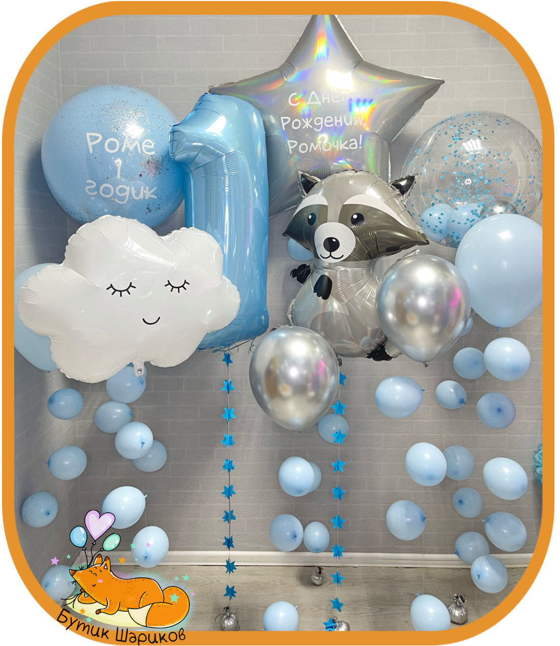 | В наборе: | - Большая звезда с индивидуальной надписью на цепочке из шаров - Большой зеркальный шар с индивидуальной надписью на цепочке из шаров - Енот на цепочке из шаров - Облако на цепочке из шаров - Большой прозрачный шар с конфетти и маленькими шариками внутри на цепочке из шаров - Цифра на гирлянде - 4 шарика пастель и хром на цепочках из шаров - 10 грузиков *Цвет шариков и надписи можно поменять |