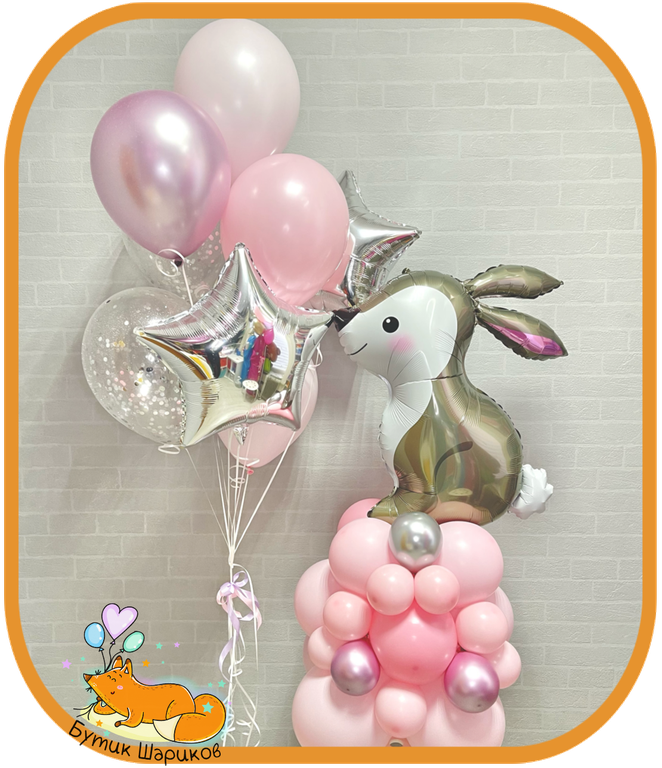 - 3 шарика "Пастель" - 1 шарик "Хром" - 2 шарика прозрачных с конфетти - 2 звезды - 1 грузик - Зайка на полянке из шариков |