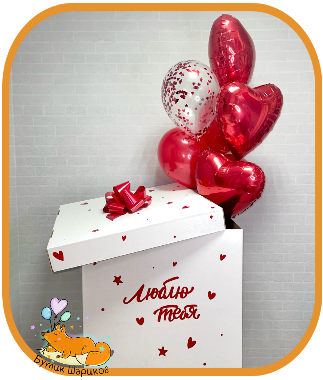 - 3 красных фольгированных сердца - 3 красных шарика пастель - 1 шарик прозрачный с конфетти - Белая коробка с надписью и бантом |